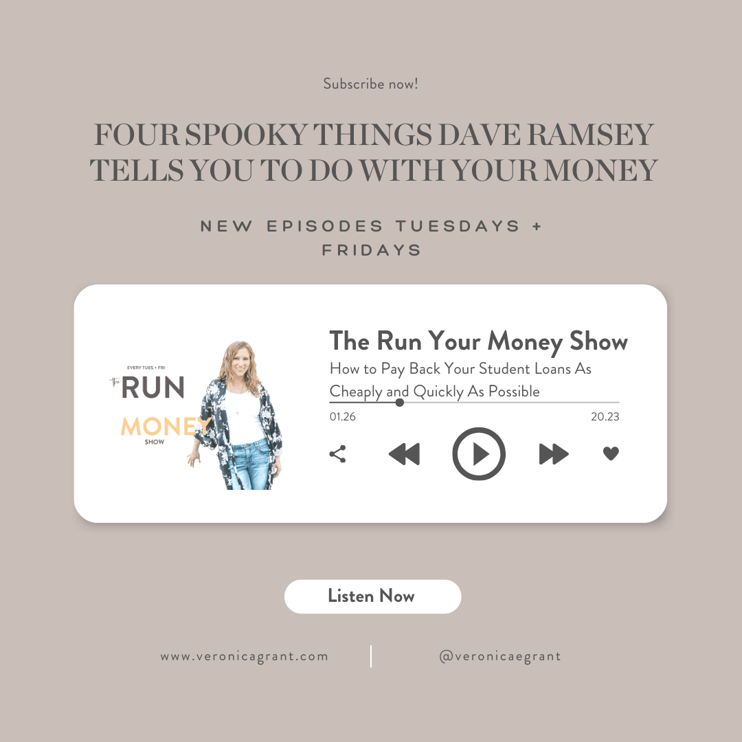 โ ๐ป๐Happy Halloween, Reader! It's that bewitching time of year when pumpkins adorn doorsteps, and the little ones transform into their favorite characters. My kid's set to roam the neighborhood as a mighty dinosaur ๐ฆ this Halloween, bringing an extra dash of prehistoric fun to the festivities. In the spirit of all things eerie and mysterious, my podcast, the Run Your Money Show, has a special spooky-themed episode brewing, ready to give you delightful shivers and thrills. Tune in for a ghoulishly good time! ๐ฑ Also, here's a treat that's not just for Halloween: I've carved out some space in my calendar to help you kickstart your journey toward financial freedom with my "Run Your Money Roadmap." If you're eager to make over your finances and need a guiding hand, let's carve out a plan together. Details of what we'll do session by session are here or below in this email. Wishing you a fa-boo-lous Halloween and an enriching journey towards financial savviness! Stay tuned for more updates and tips in your inbox. โ Four Spooky Things Dave Ramsey Tells You to Do with Your MoneyI believe there are more roads to Rome than one and that you don't have to run your money exactly how I would to optimize and grow it. However, when I find advice that is just wrong, I have to say something, especially if that advice is covered in shame. Few names ring as loud as Dave Ramsey's in the financial advice world. His advice has made its way into millions of households, and you may follow some of it, even if you've never consumed his content. Some of this philosophies are that far removed from him. This week on the blog and podcast, I'm going through some of Dave Ramsey's most popular ideas and why they're not just different opinions but following them can be bad for your money. (and your mental health!) 1. Debt Is Morally Neutral Debt is Dave Ramsey's archnemesis and he often shames his listeners for having debt. If you've ever listened to him, you've probably heard phrases like "bad with money" or "irresponsible" thrown around when discussing debt. The problem with this approach? It's a bit too simplistic. Debt isn't black and white. Some people use it as a tool to leverage and grow their money. In other situations, medical emergencies, job loss, or increasing inflation can lead to debt. Blaming people for their debt without considering these nuances isn't fair and, in fact, can be harmful. |